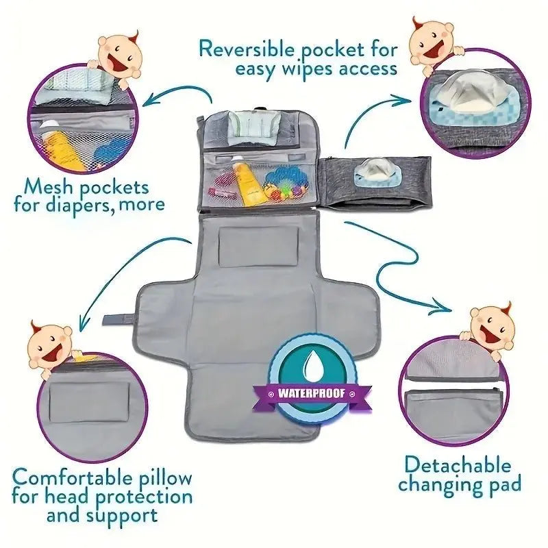 - وسادة تغيير الحفاضات المحمولة هي الحل المثالي للأهل الذين يحتاجون إلى وسيلة مريحة وعملية لتغيير الحفاضات أثناء التنقل، مع الحفاظ على نظافة وراحة الطفل في جميع الأوقات.