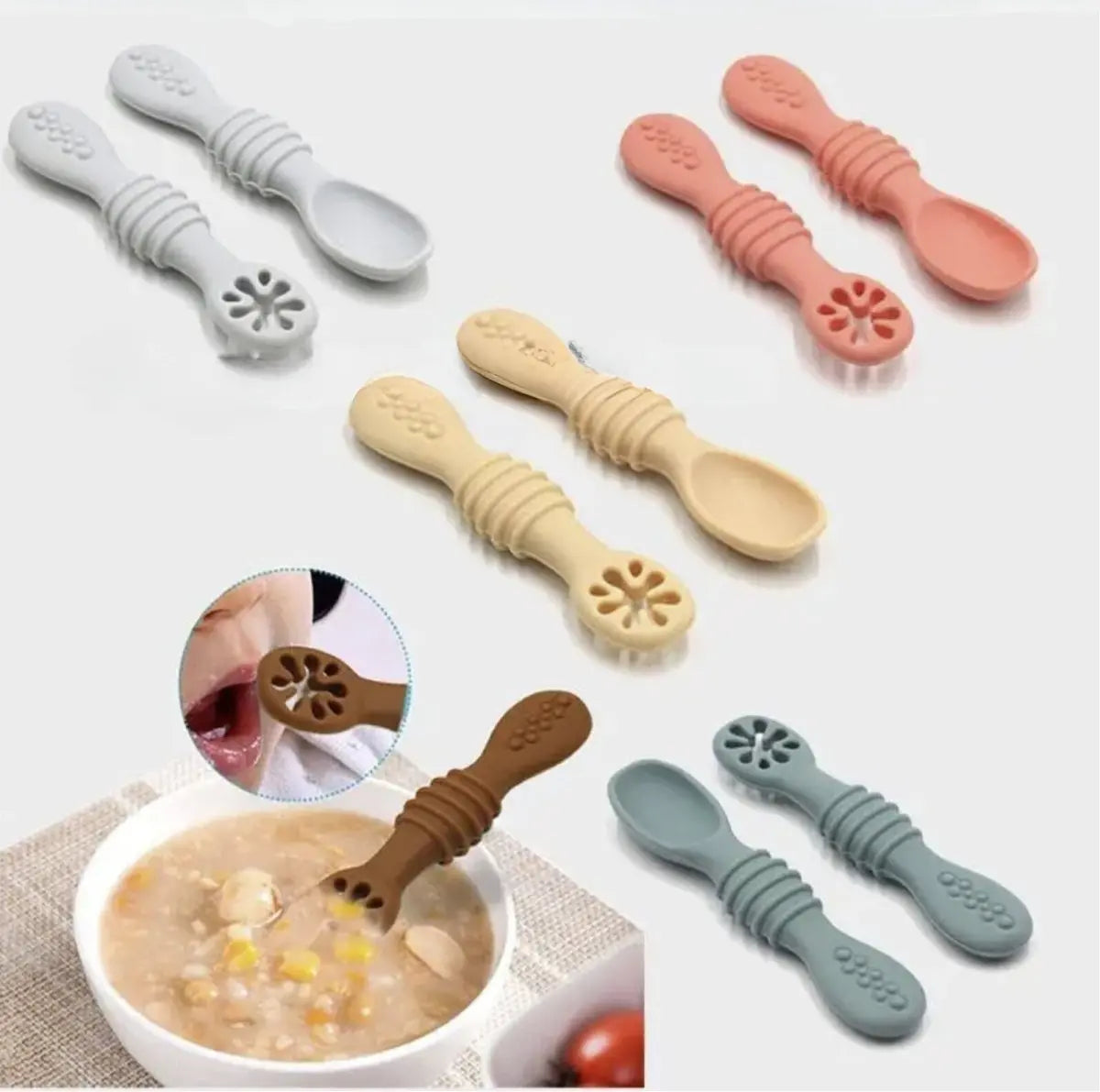 - هذا الطقم المثالي مصمم خصيصًا للأطفال، ليكون الرفيق الأمثل أثناء تناول الطعام و يتكون من ملعقة وشوكة مصنوعتين من السيليكون المرن.