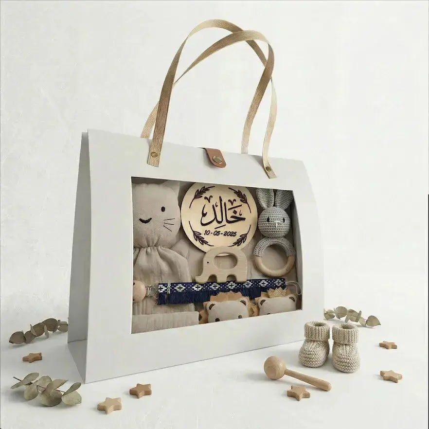 each Package of هدايا مواليد بالإسم - الصندوق الاقتصادي - متجر أمومة contains :
