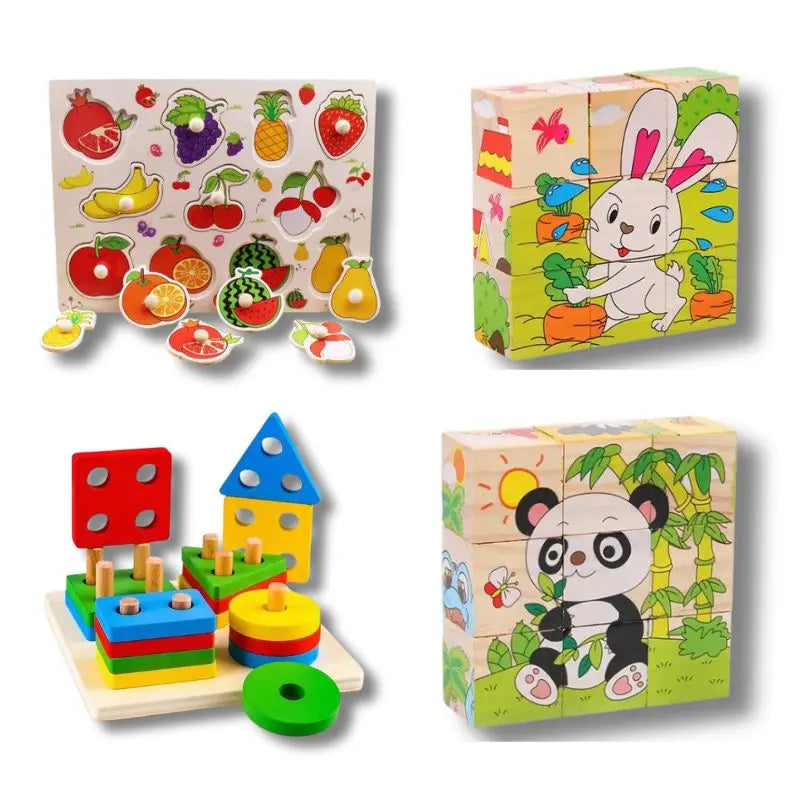 - - عدد 2 مكعب بازل( حيوانات) - 1 لوح الفواكه الخشبي - لوح مونتيسوري للاشكال الهندسية.